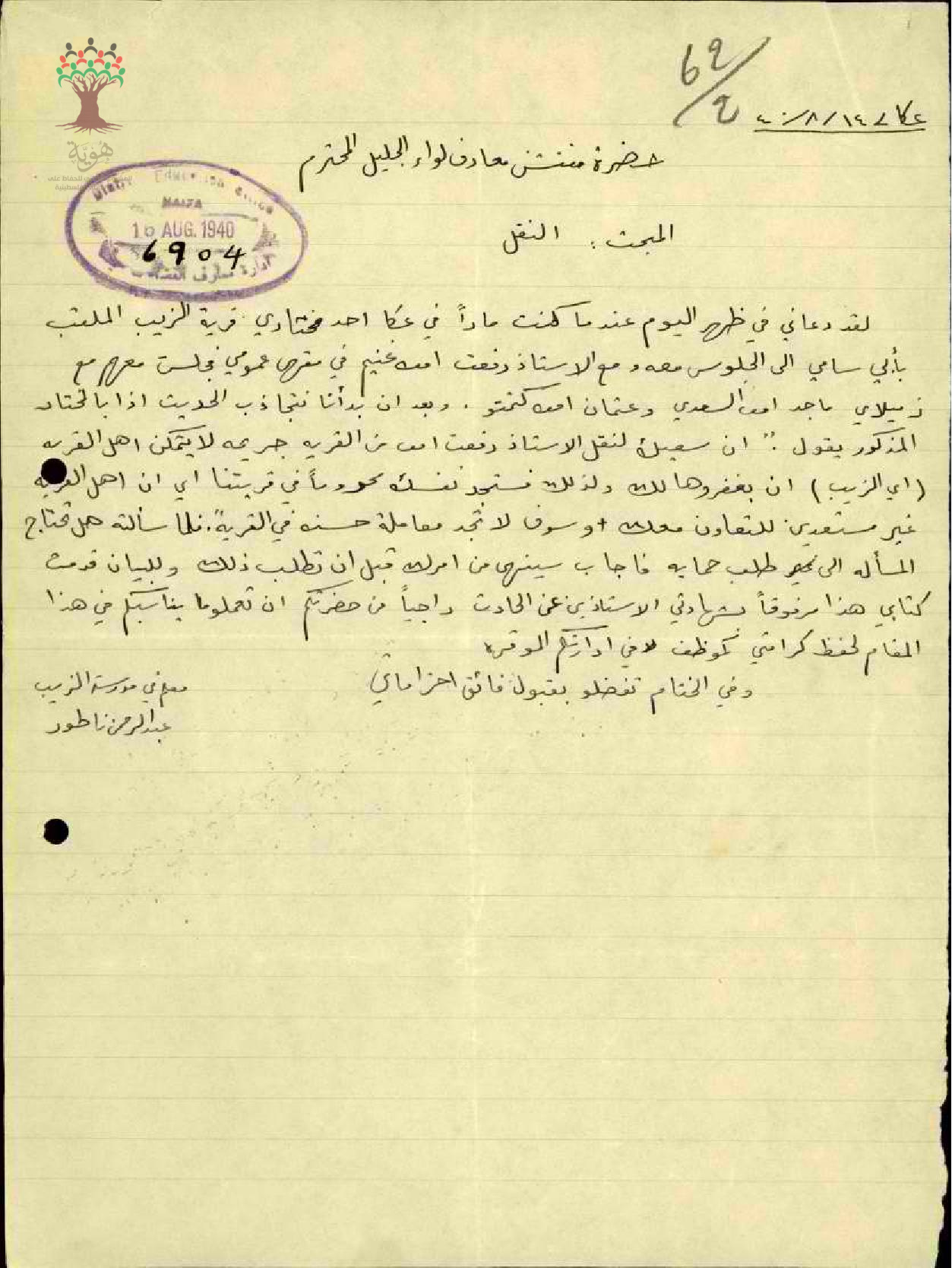 ادلاء بافادة المعلم عبد الرحمن فرج الناطور حول موضوع نقل المعلم رفعت غنيم من مدرسة الزيب وفيه يتحدث المعلم عن تفاصيل حدثت معه ومع المختار ابو سامي