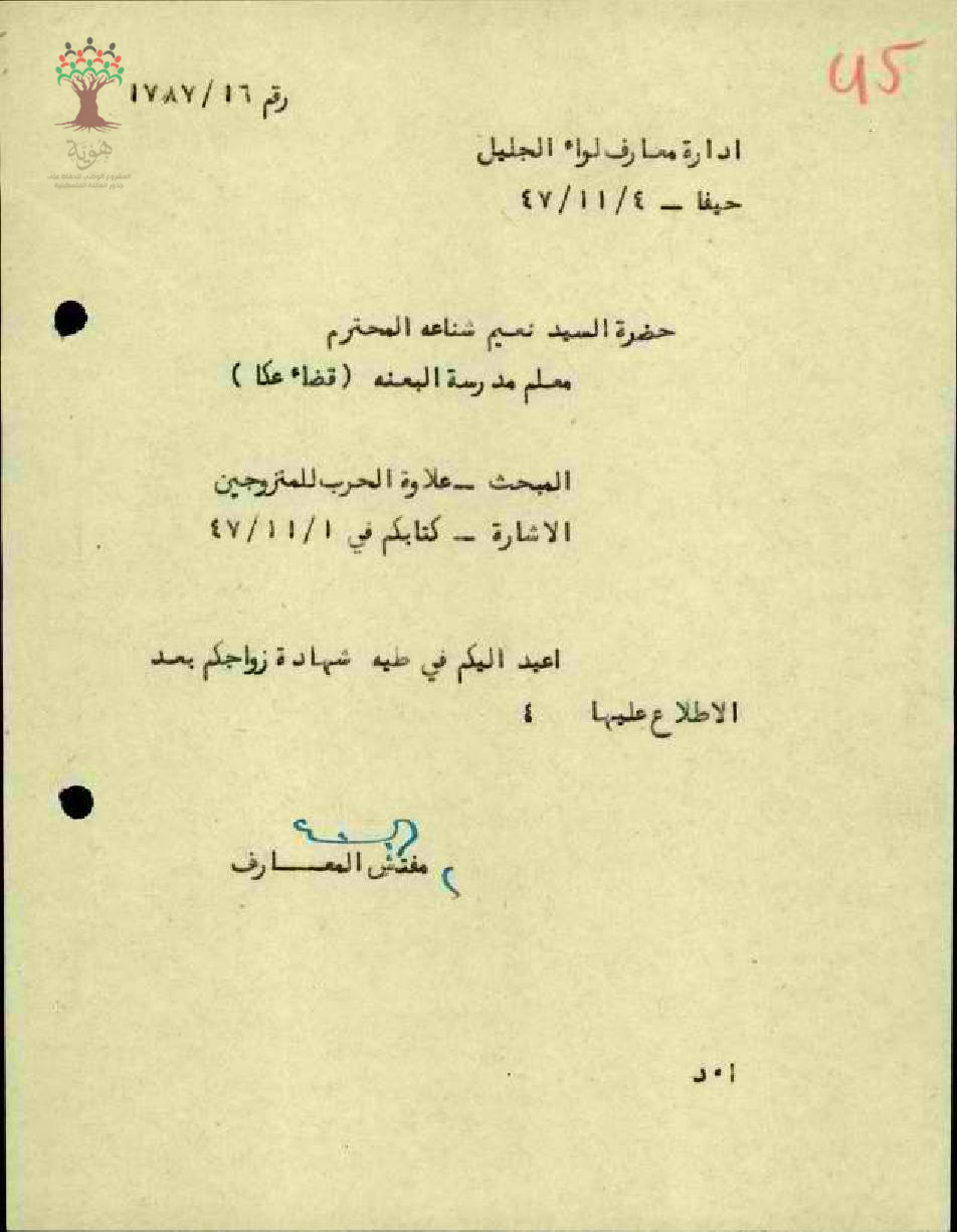 كتابة من مفتش المعارف الى المعلم نعيم يوسف شناعة طية شهادة زواجكم