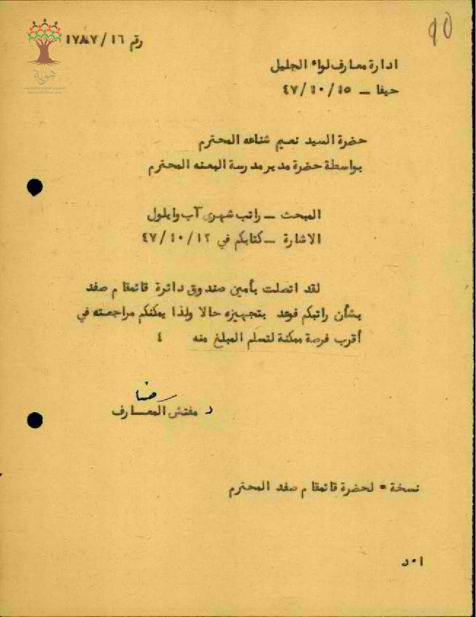 رسالة من مفتش المعارف الى المعلم نعيم يوسف شناعة لقد اتصلت بامين صندوق دائرة قائم المقام صفد بشان راتبكم