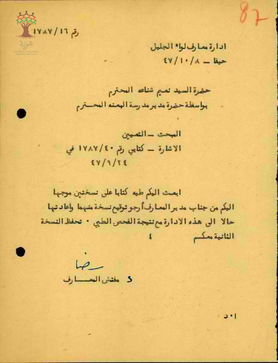 كتاب من مفتش المعارف الى المعلم نعيم يوسف شناعة