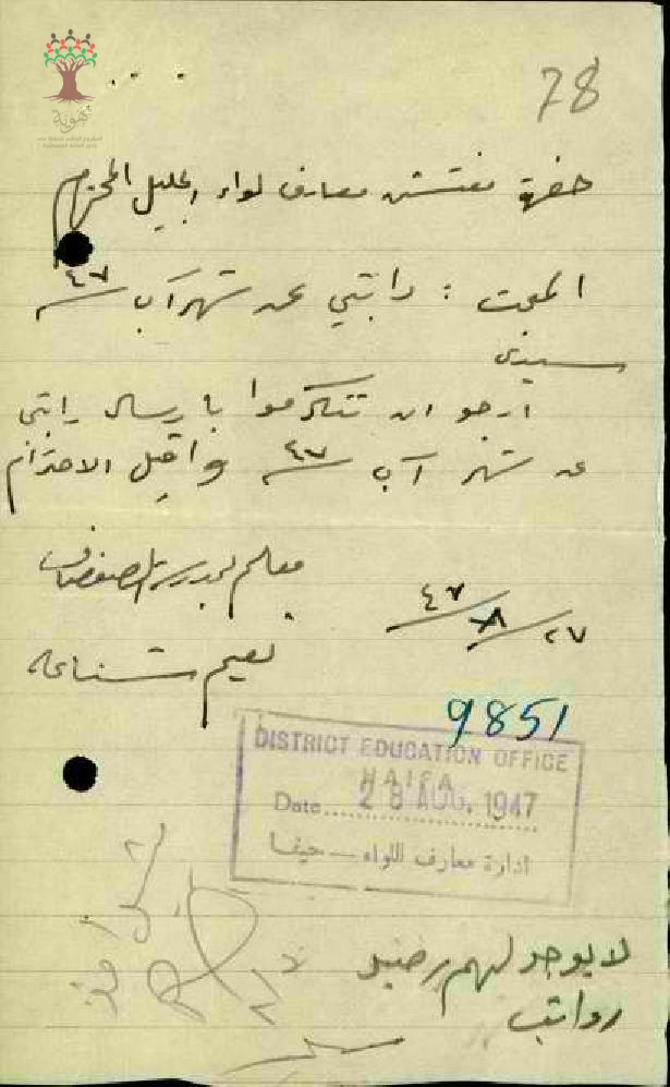 رسالة من المعلم نعيم يوسف شناعة الى مفتش المعارف ارجو ان تتكرمو بارسال راتبي عن شهر اب