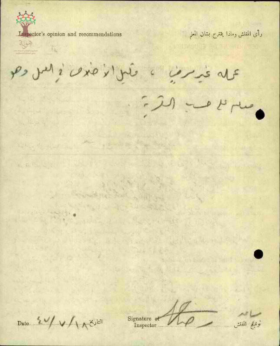 رأي المفتش بالمعلم نعيم يوسف شناعة عمله غير مرضيا قليل الاخلاص في المعلم وهوا معلم على حساب القرية