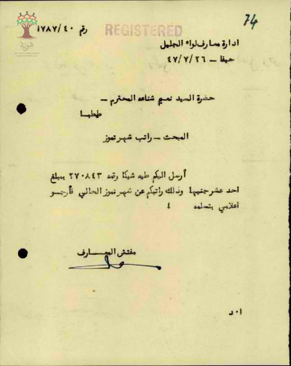 رسالة من مفتش المعارف الى المعلم نعيم يوسف شناعة ارسل اليكم طيه شيكا بمبلغ احد عشر جنيها وذالك راتبكم عن شهر تموز