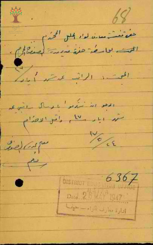 رسالة من المعلم نعيم يوسف شناعة الى مفتش معارف الجليل ارجو ان تتكرمو بارسل راتبي عن شهر ايار