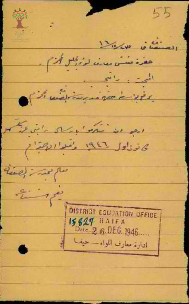رسالة من المعلم نعيم يوسف شناعة الى مفتش معارف الجليل ارجو ان تتكرمو بارسل راتبي عن شهر كانون الاول