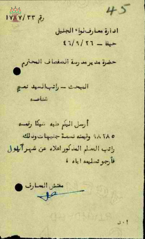 كتاب من مفتش المعارف الى مدير مدرسة الصفصاف بسبب تسليم راتب المعلم نعيم شناعة