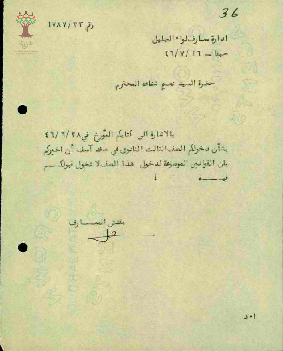 رسالة من مفتش المعارف الى المعلم نعيم يوسف شناعة اشارة الى كتابكم بشان دخولكم الصف الثالث الثانوي في صفد اسف ان اخبركم بان القوانيين الموضوعة لدخول هذا الصف لا تخول قبولكم