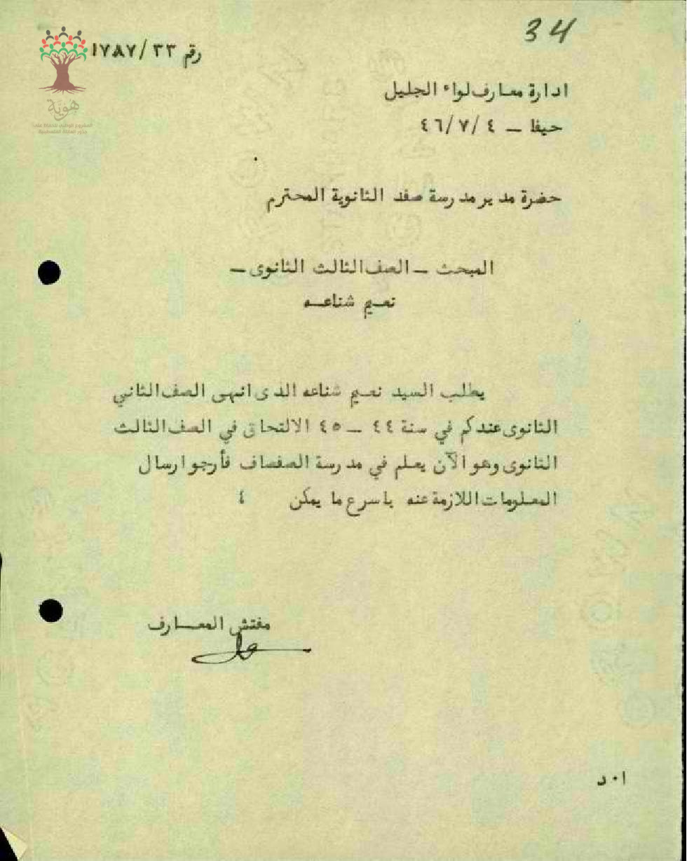 رسالة من مفتش المعارف الى مدير مدرسة الصفصاف بخصوص التحق المعلم نعيم يوسف شناعة في الصف الثالث الثانوي وهو الان يعلم في مدرسة الصفصاف فارجو ارسال المعلومات اللازمة عنه