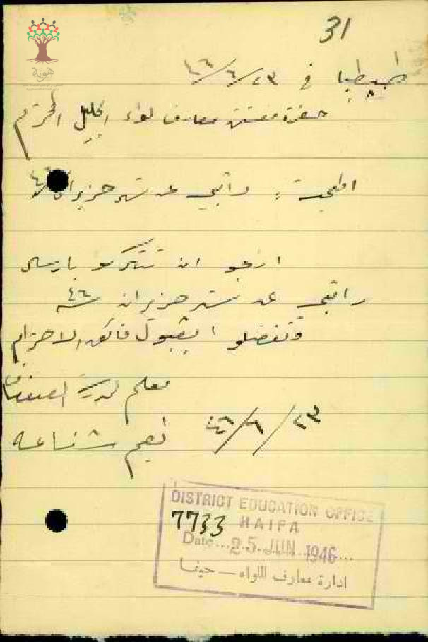 رسالة من المعلم نعيم يوسف شناعة الى مفتش المعارف ارجو ان تتكرمو بارسل راتبي عن شهر حزيران