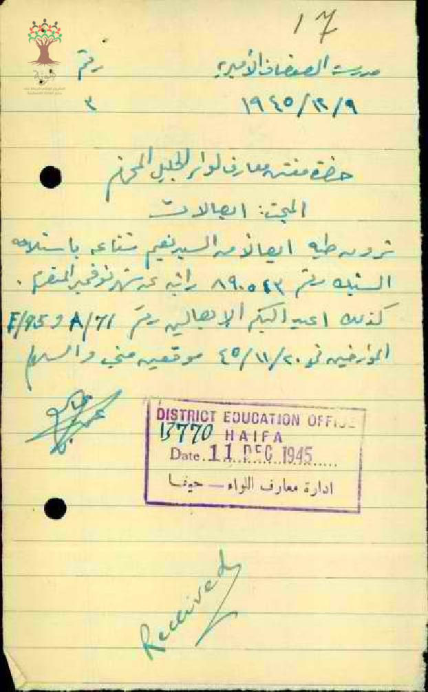 رسالة من مدير المدرسة الى مفتش معارف الجليل شروط طيه ايصالا من المعلم نعيم يوسف شناعة با ستلامه