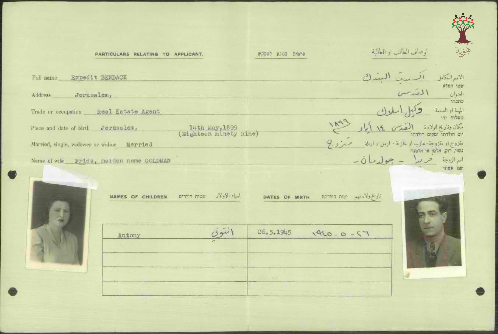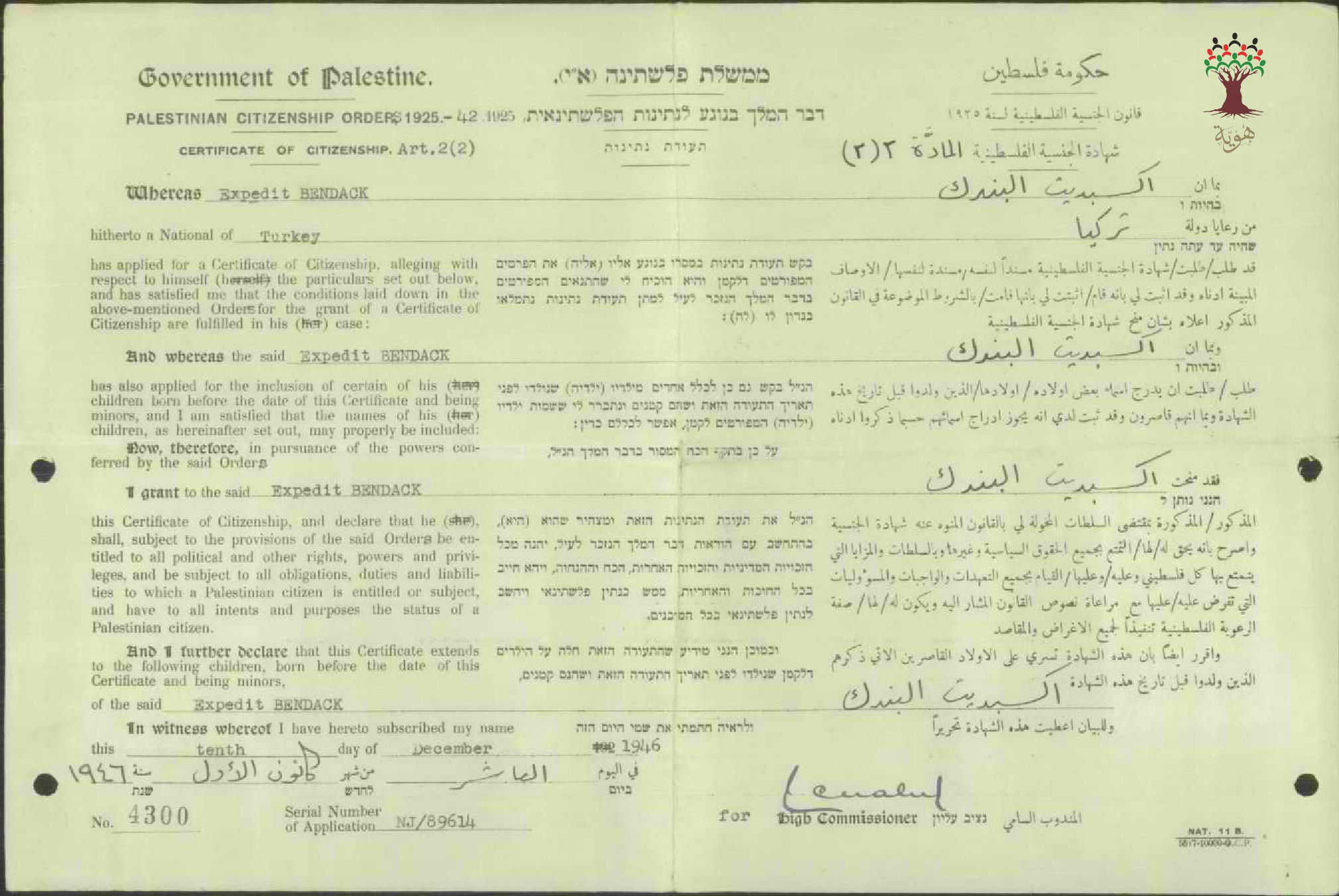شهادة الجنسية الفلسطينية لـ اكسبديت بندك وفريدا بندك