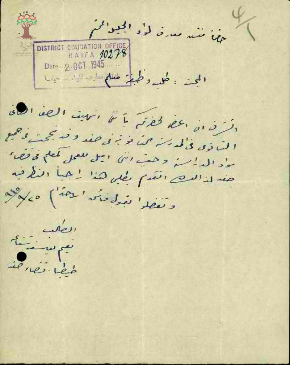 رسالة من المعلم نعيم يوسف شناعة الى مفتش معارف الجليل اتشرف ان اعرض لجضرتكم بانني انتهيت الصف الثانوي في المدرسة الثانوية في صفد وقد نجحت في جميع مواد الدراسة