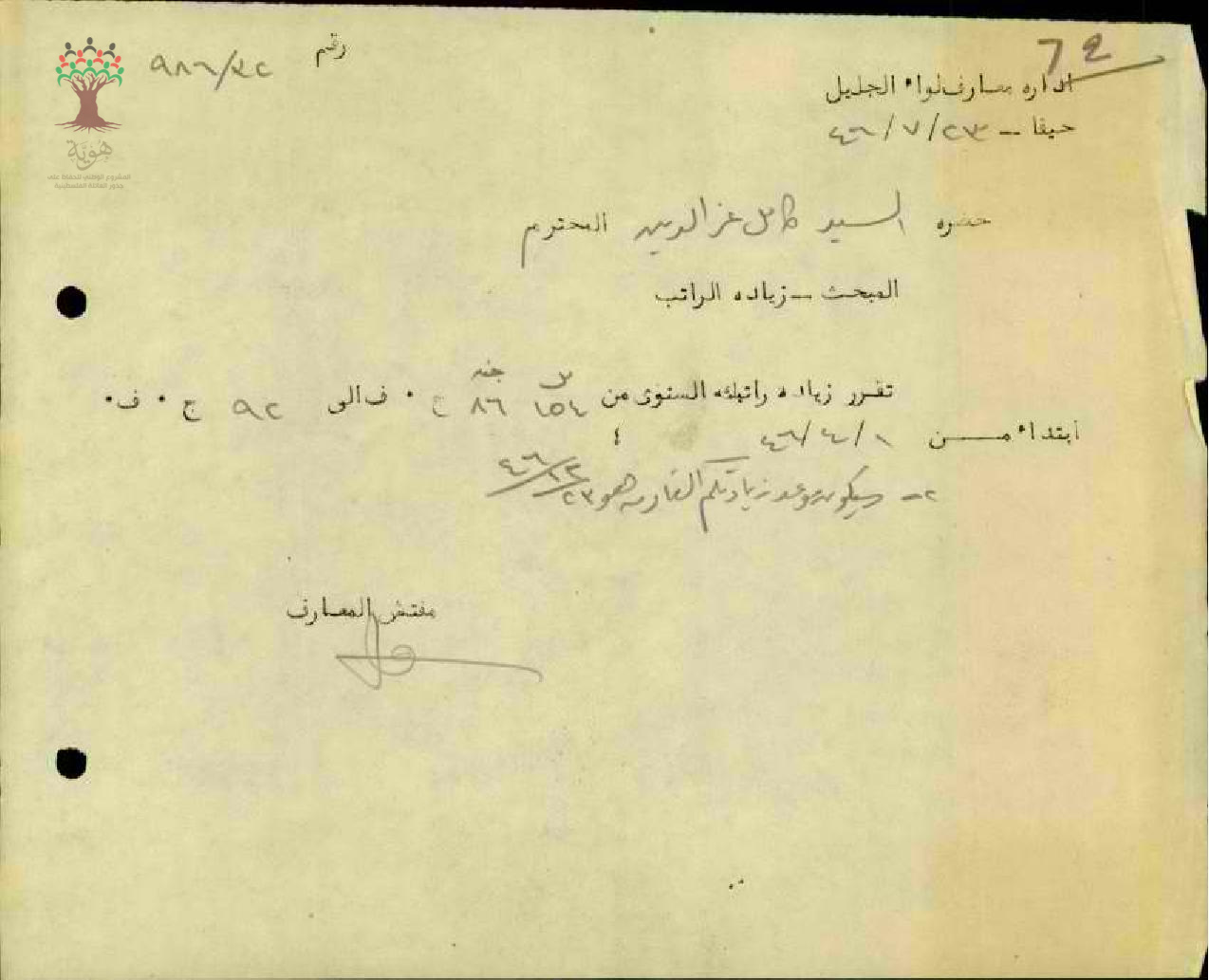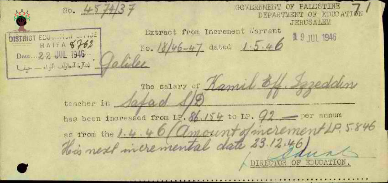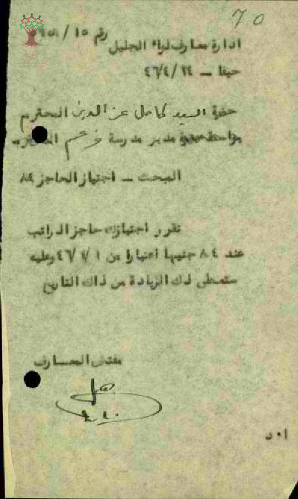 قرار زيادة الراتب السنوي للمعلم كامل عز الدين من مدرسة الدامون