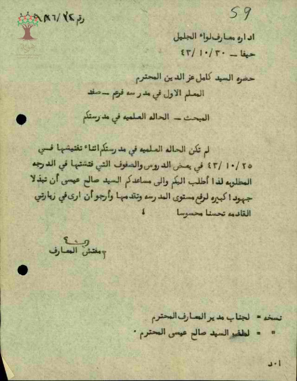 تقرير حول الحالة العلمية في المدرسة موجه للمعلم كامل عز الدين