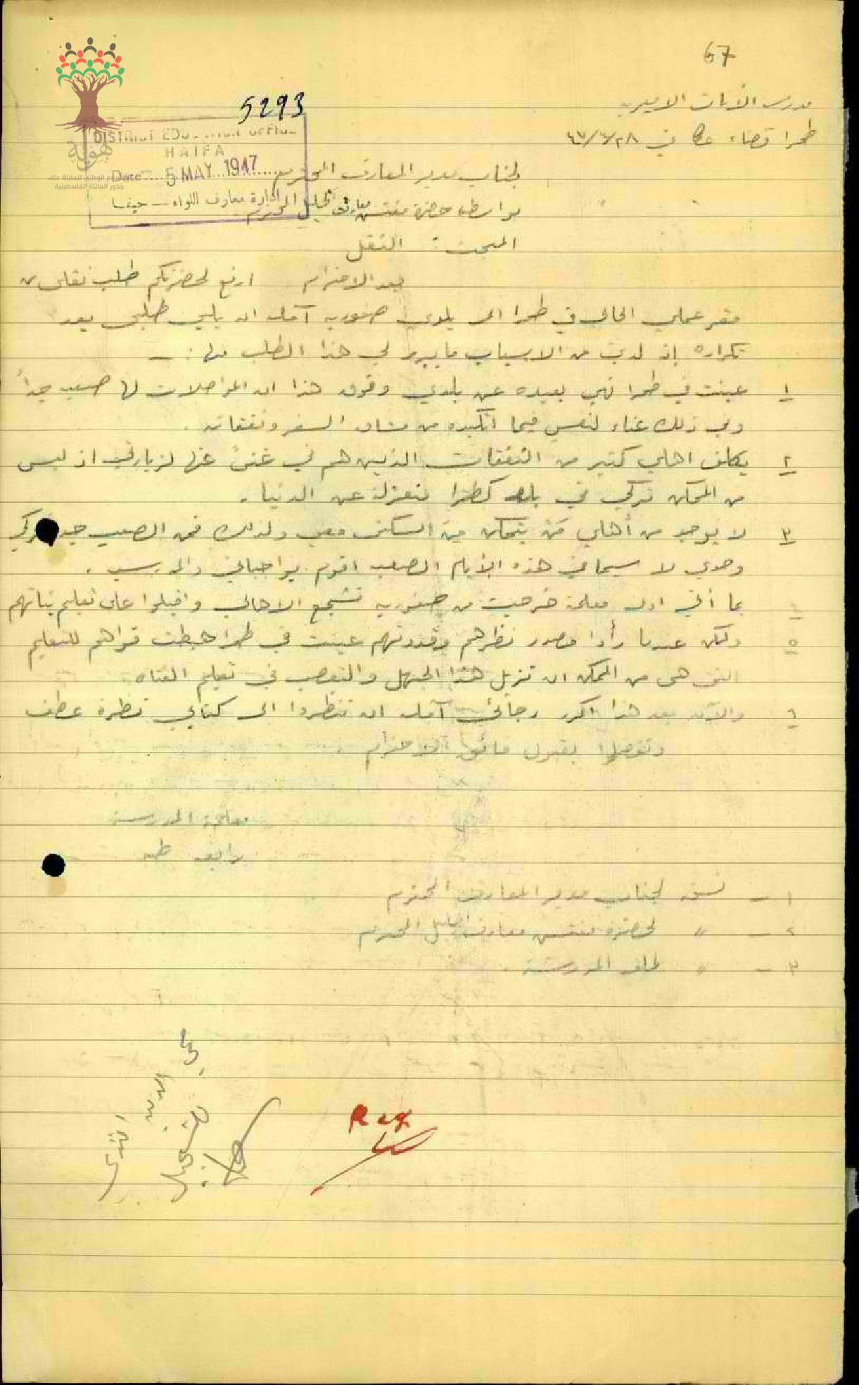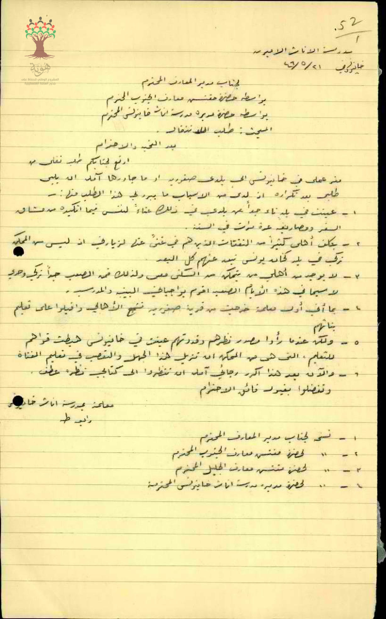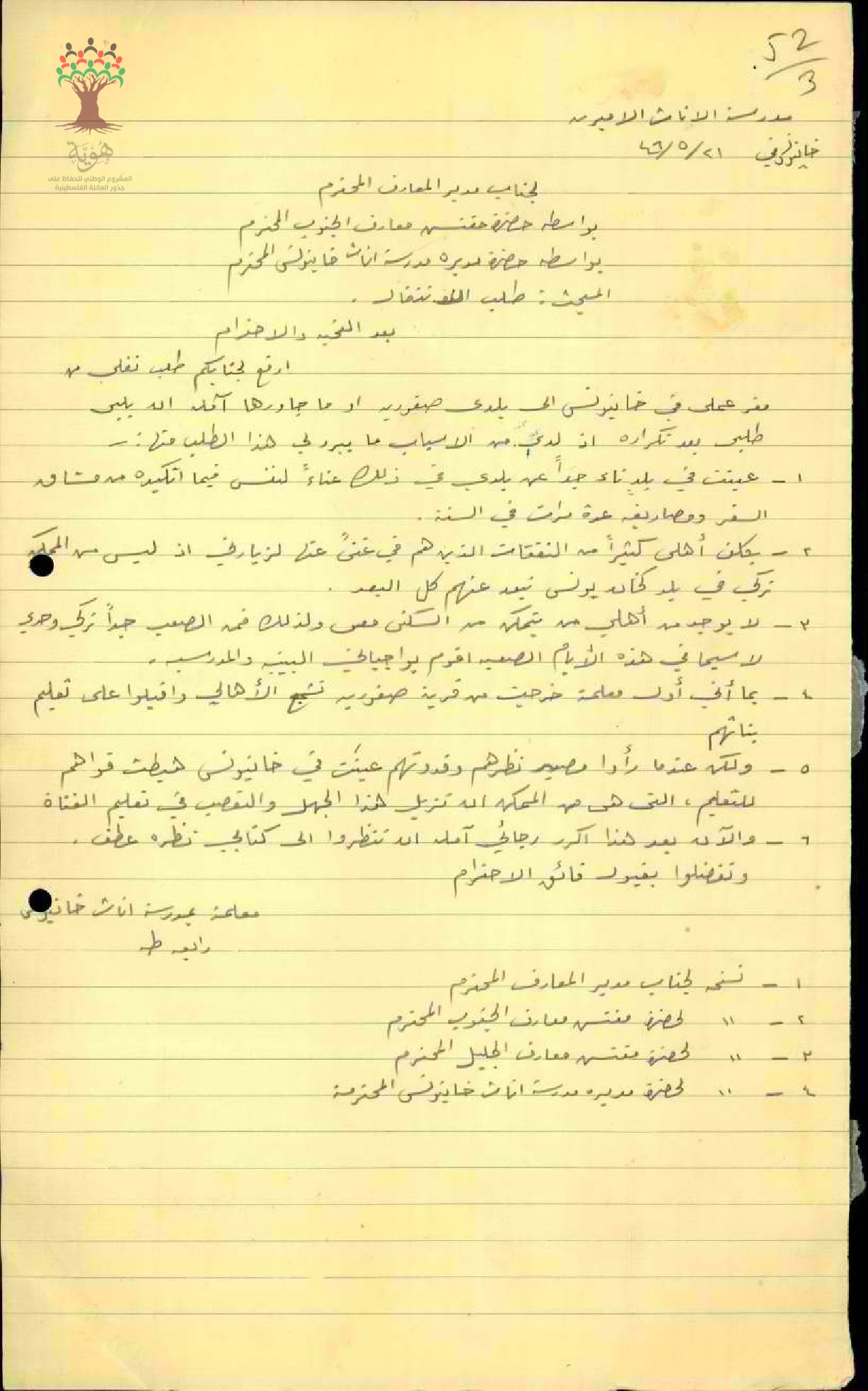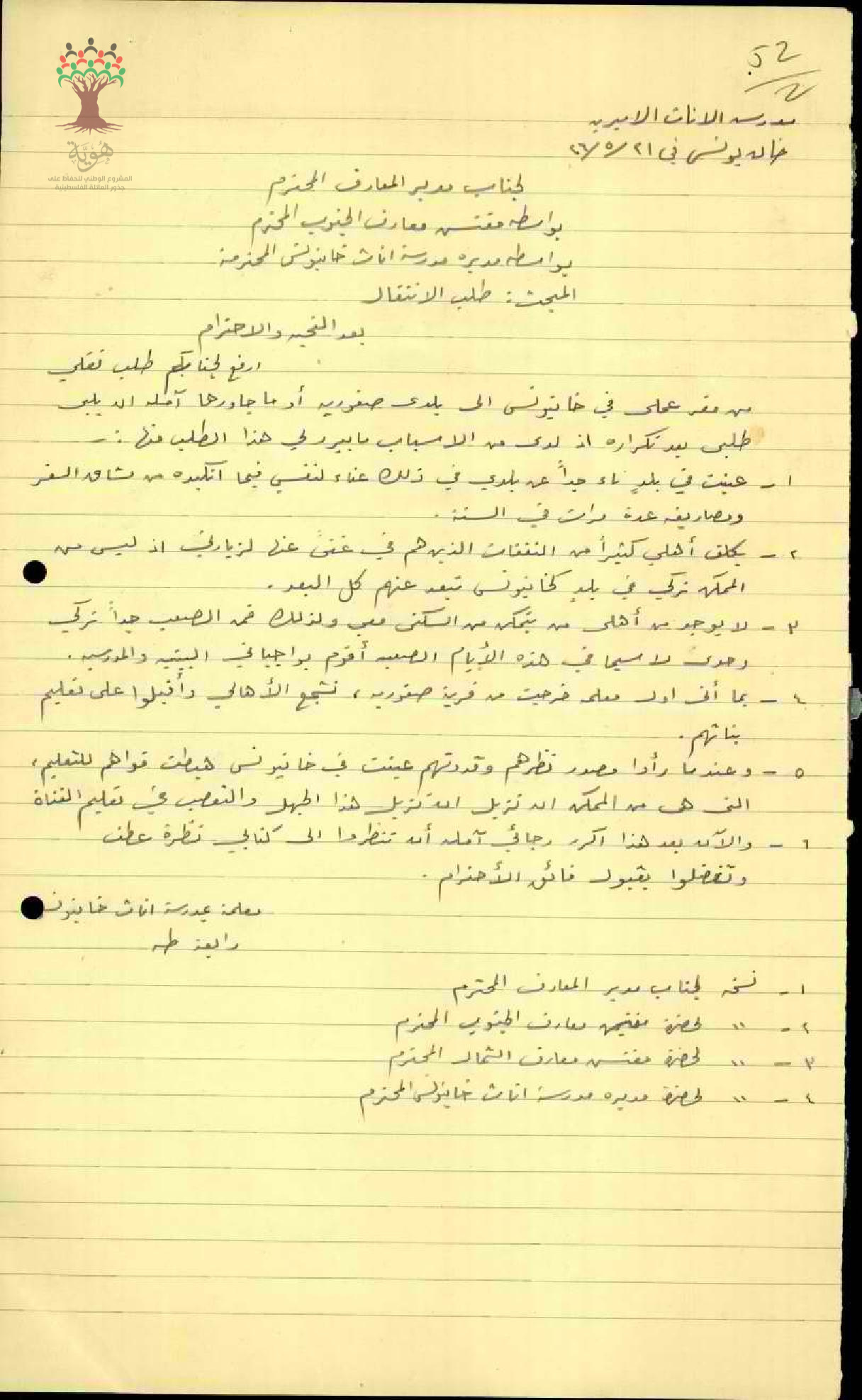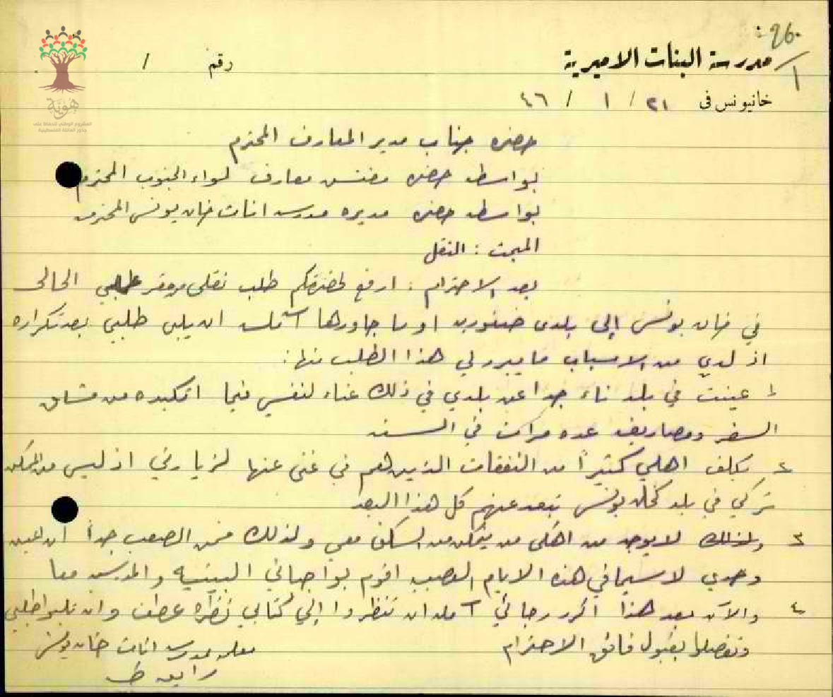 طلب نقل مقدم من المعلمة رابعة عبد الحميد طه من مدرسة خان يونس تلطب فيه نقلها من بلدة خان يونس الى قريتها صفورية