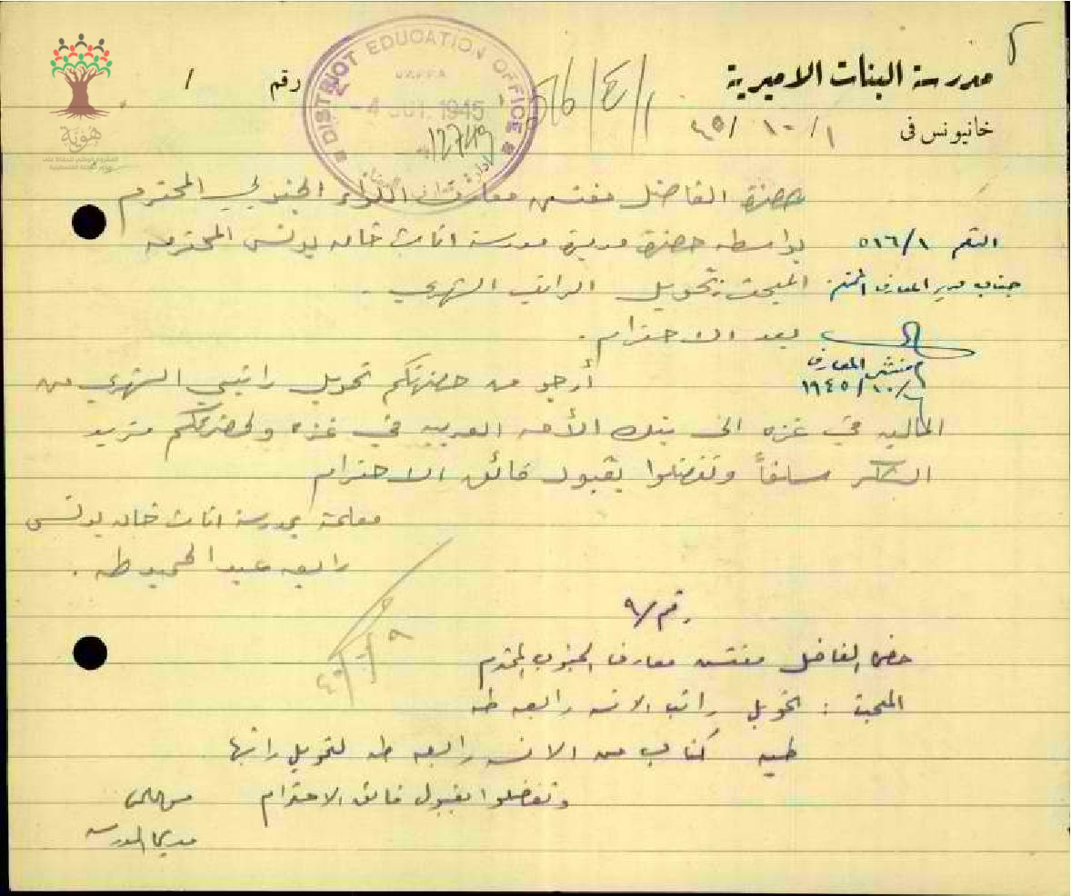 طلب تحويل الرتاب الشهري الى بنك الامة العربية في غزة من قبل المعلمة رابعة عبد الحميد طه