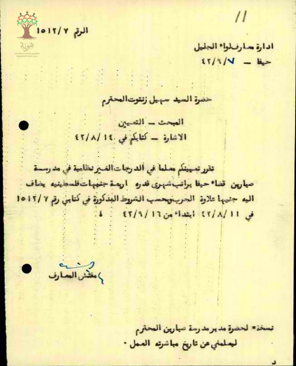 قرار تعيين المعلم سهيل زنتوت معلما اضافيا في مدرسة صبارين براتب شهري اربع جنيهات فلسطينية
