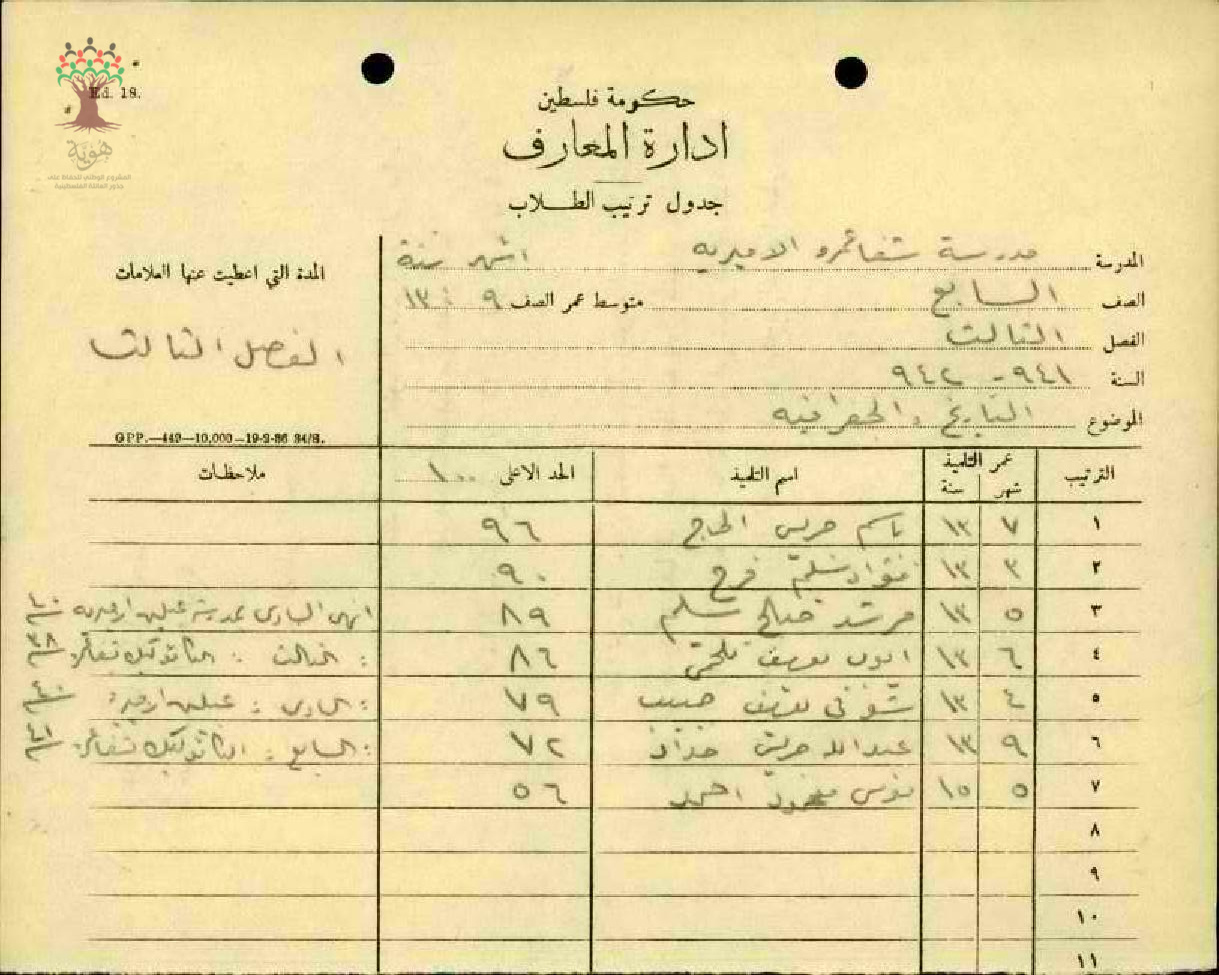 جدول ترتيب طلاب الصف السابع من مدرسة شفاعمرو الاميرية