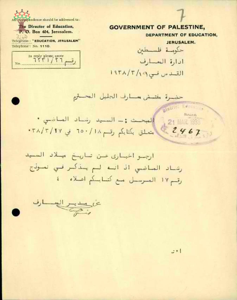 رسالة من مدير المعارف الى مفتش المعارف ارجو اخباري عن تاريخ ميلاد المعلم رشاد ماضي