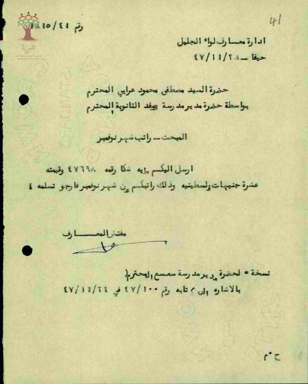 رسالة من مفتش المعارف الى المعلم مصطفى عرابي ارسل اليكم طيه شيكا قيمته عشر جنيهات فلسطينيه وذلك راتبكم عن شهر نوفمر