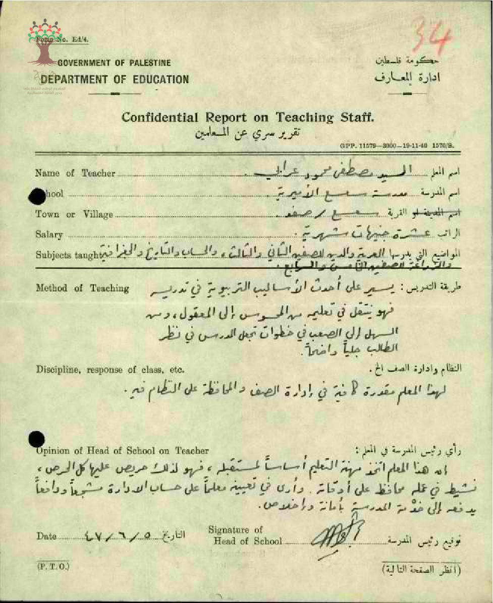 تقرير سري عن المعلم مصطفى عرابي في مدرسة سعسع وطريقة تدريس _يسير على احدث الاساليب التربيوية في تدريس فهو ينتقل في تعليمه من المحسوس الى المعقول ومن السهل الى الصعب