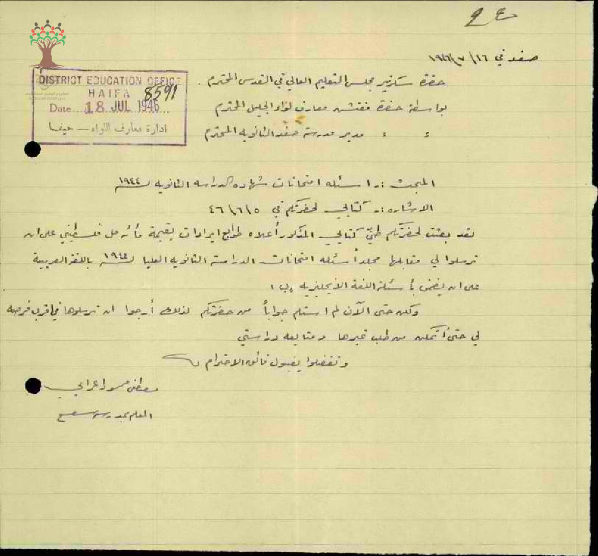 رسالة من المعلم مصطفى عرابي الى حضرة سكرتير مجلس التعليم بخصوص اسئلة امتحانات شهادة المدراسة