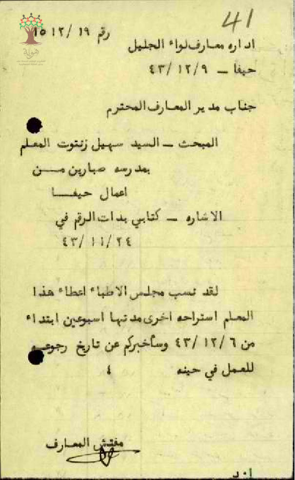 قرار اعطاء المعلم سهيل زنتوت اسراحة عمل