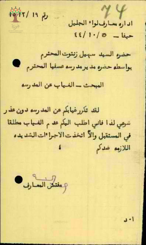 تحذير موجه للمعلم سهيل زنتوت بسبب تكرار الغياب عن المدرسة