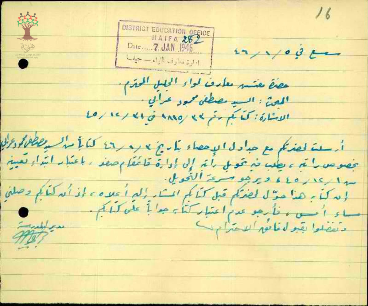 رسالة من مدير المدرسة الى مفتش المعارف بخصوص تحويل راتب المعلم مصطفى عرابي
