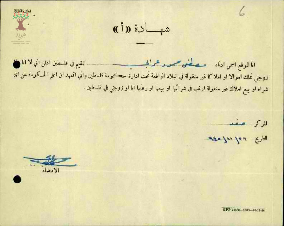 شهادة نفي ملكية المعلم مصطفى عرابي