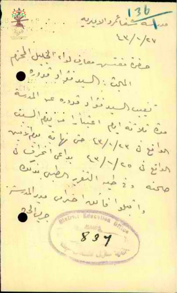 رسالة من مدير المدرسة الى مفتش المعارف بخصوص غياب المعلم فؤاد قدورة عن المدرسة