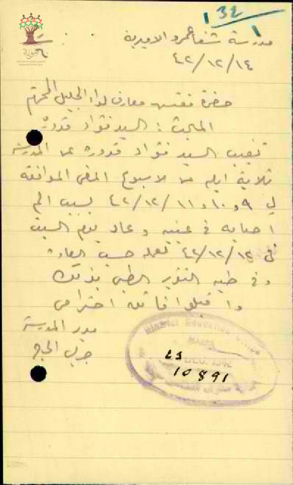 رسالة من مدير المدرسة الى مفتش المعارف بخصوص غياب المعلم فؤاد قدورة عن المدرسة