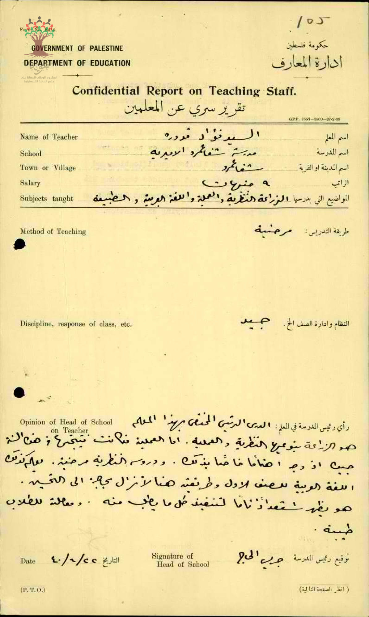 تقرير سري عن المعلم فؤاد قدورة في مدرسة شفا عمرو