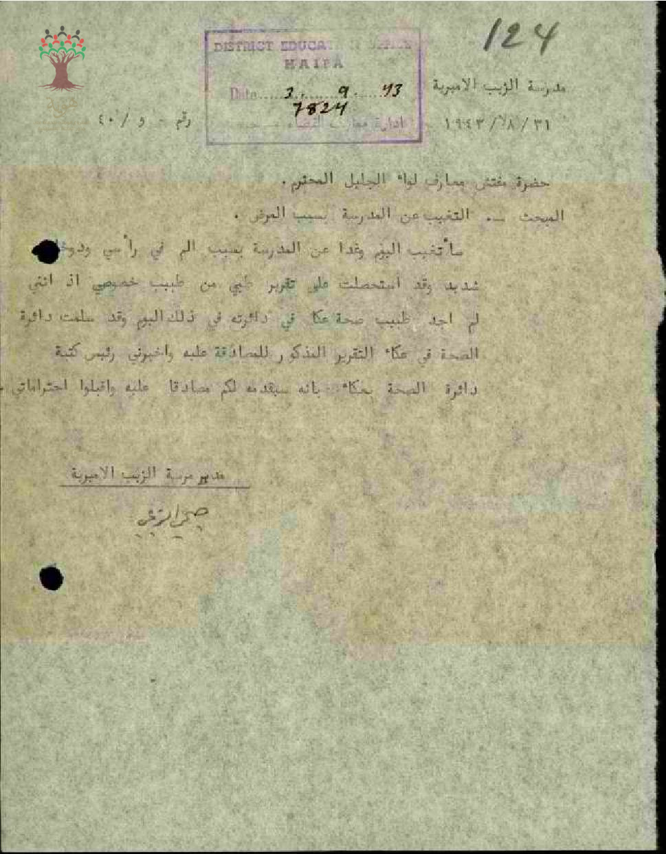 رسالة من المعلم صبحي الزعبي الى مفتش المعارف يطلب فيها التغيب عن العمل