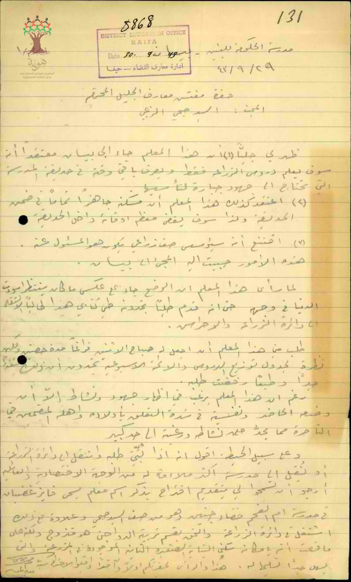 رسالة من مدير مدرسة بيسان الى مفتش المعارف بخصوص المعلم صبحي الزعبي