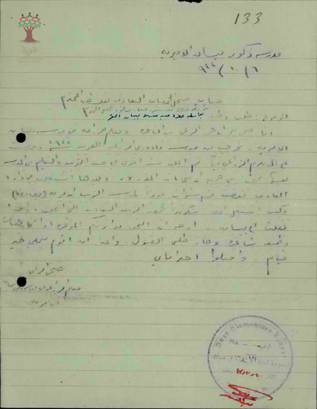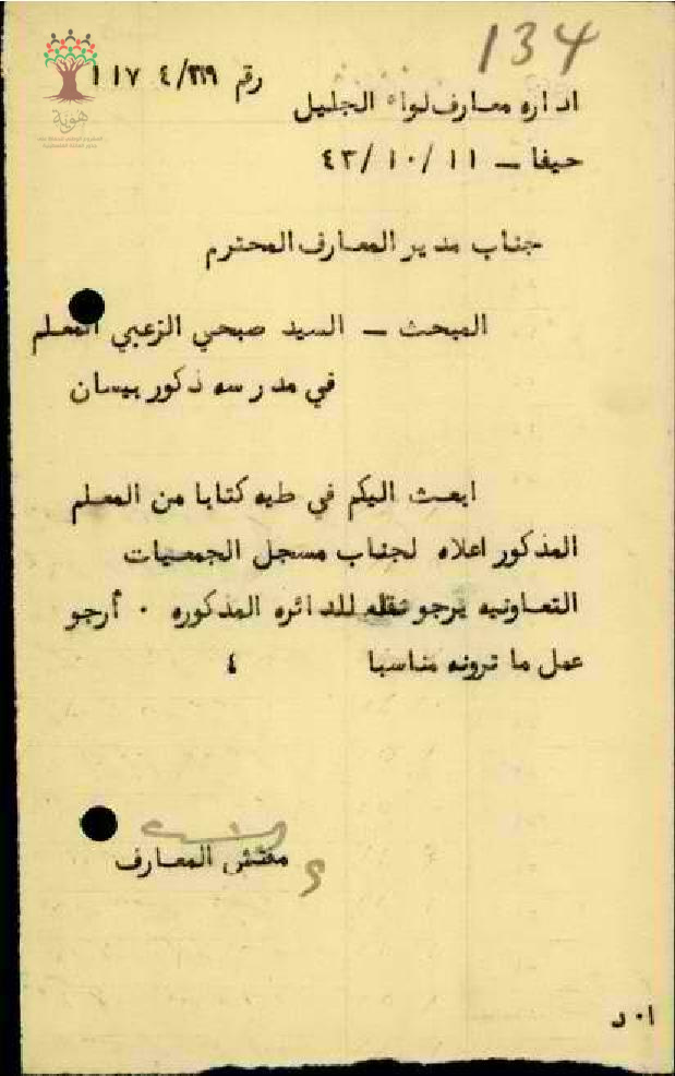 رسالة من مفتش المعارف الى مدير المعارف بخصوص نقل المعلم صبحي الزعبي مرفقة بطلب النقل