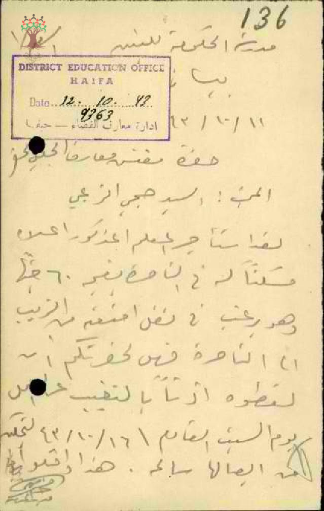 رسالة من مدير مدرسة بيسان الى مفتش المعارق بخصوص اذن غياب للمعلم صبحي الزعبي