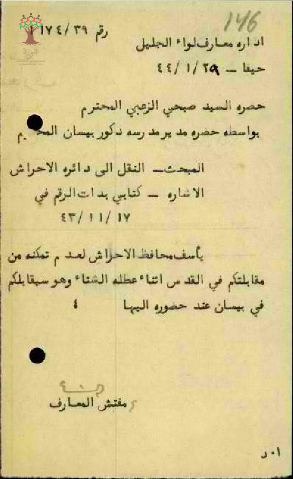 رسالة من مفتش المعارف الى المعلم صبحي الزعبي بخصوص مقابلة محافظ الأحراش