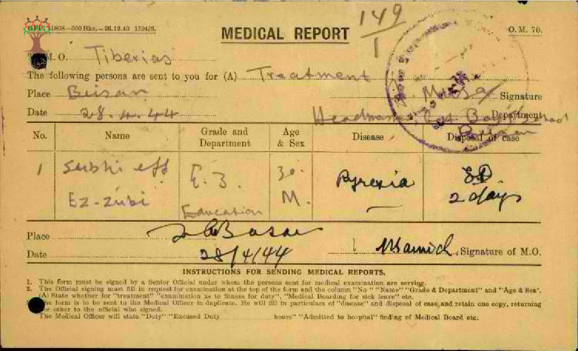 رسالة من مدير مدرسة بيسان الى مفتش المعارف بخصوص تغيب المعلم صبحي الزعبي مرفقة بالتقرير الطبي