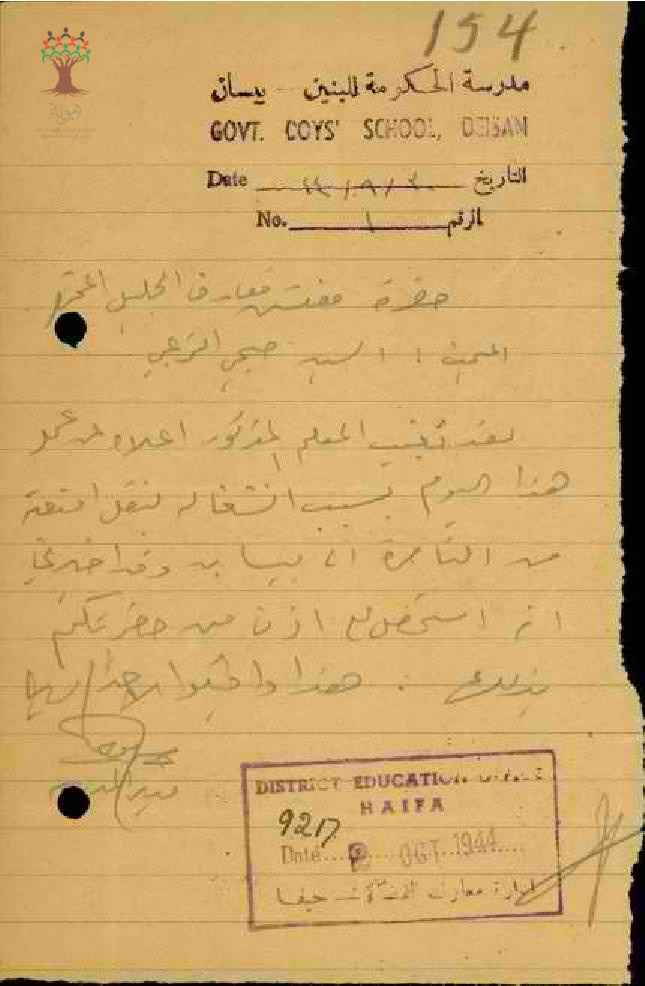 رسالة من مدير مدرسة بيسان الى مفتش المعارف بخصوص تغيب المعلم صبحي الزعبي بسبب نقل امتعته من الناصرة الى بيسان