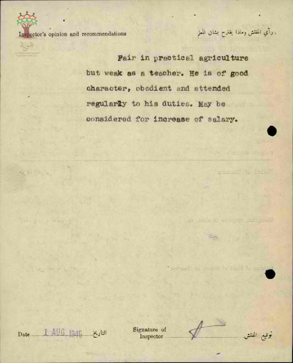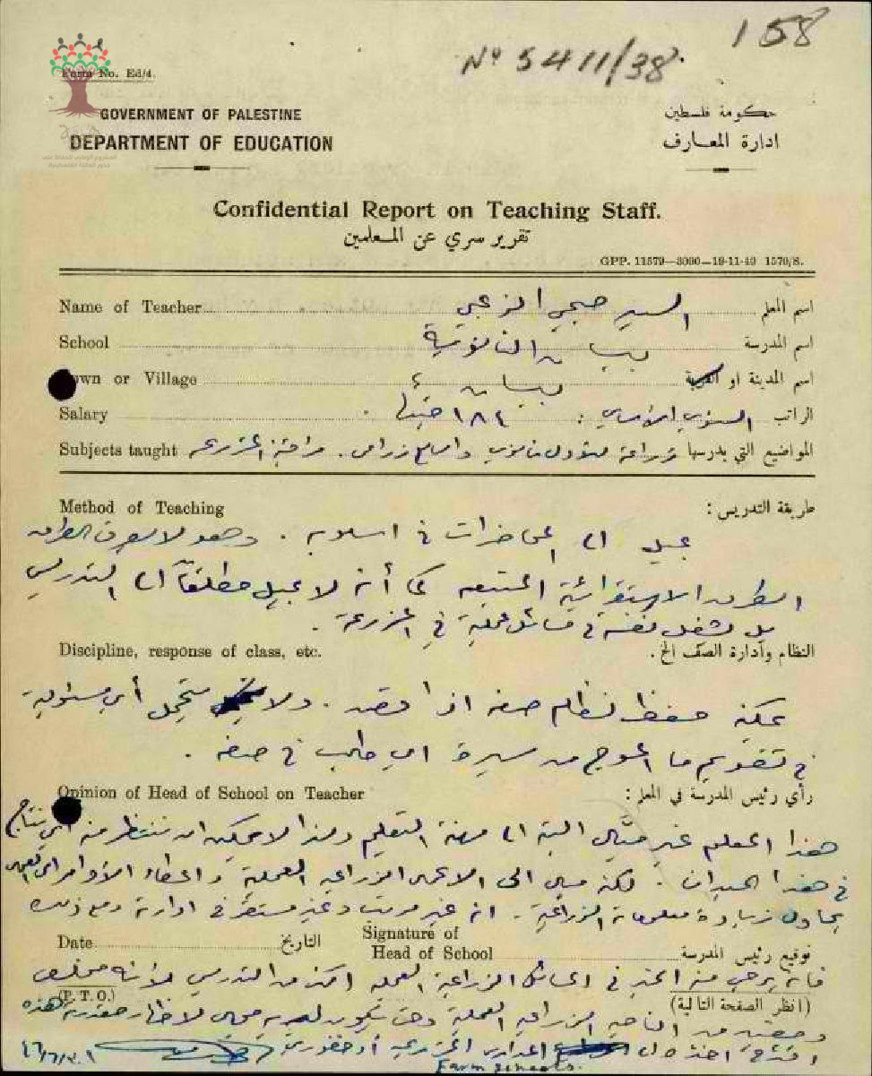 تقرير تفصيلي عن أداء المعلم صبحي الزعبي في مدرسة بيسان سنة 1946