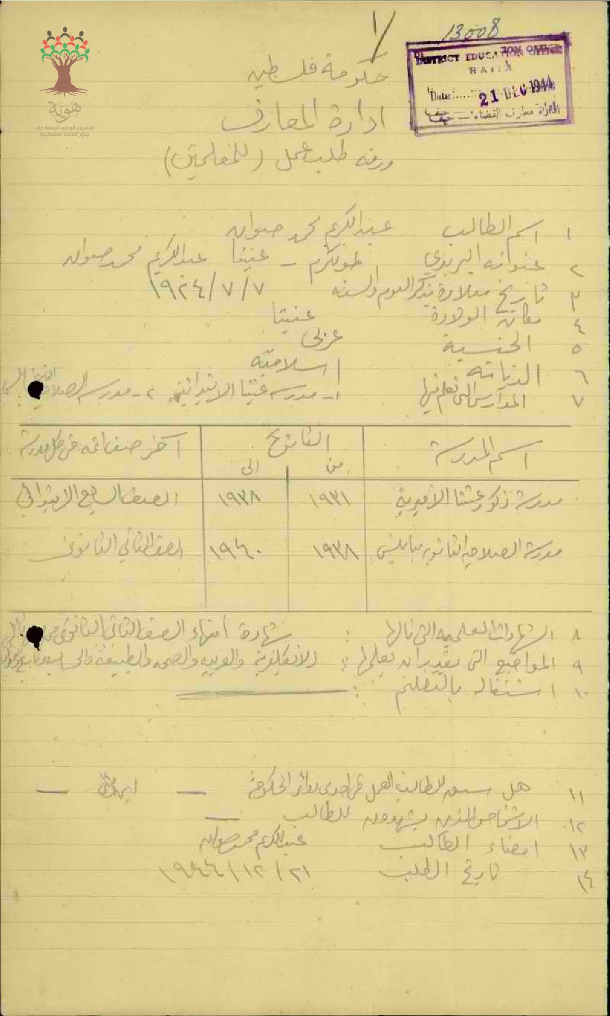 ورقة طلب عمل للمعلم عبد الكريم صوان/عنبتا