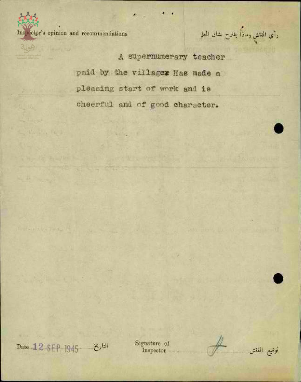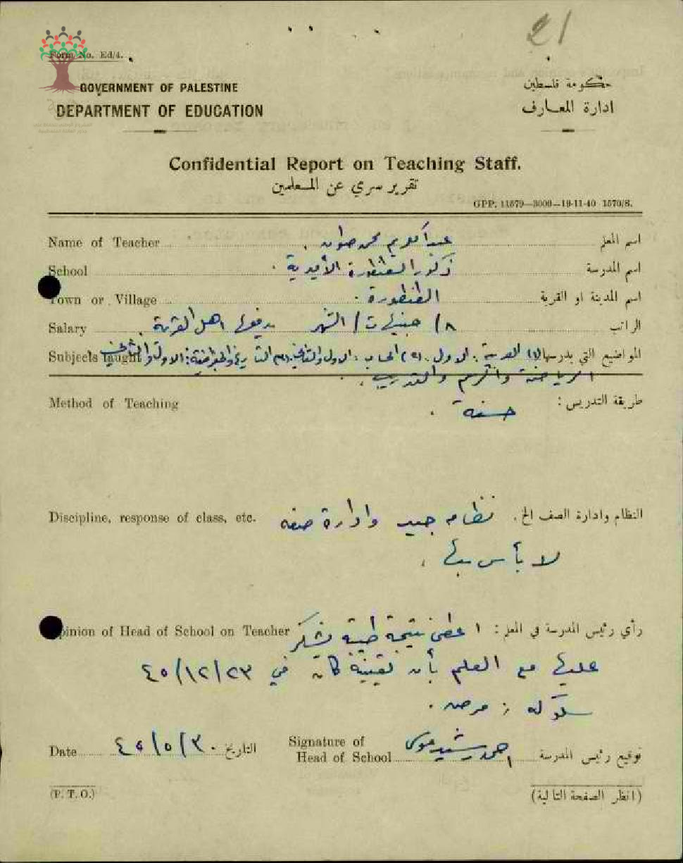 تقرير تفصيلي عن أداء المعلم عبد الكريم صوان في مدرسة الطنطورة سنة 1945