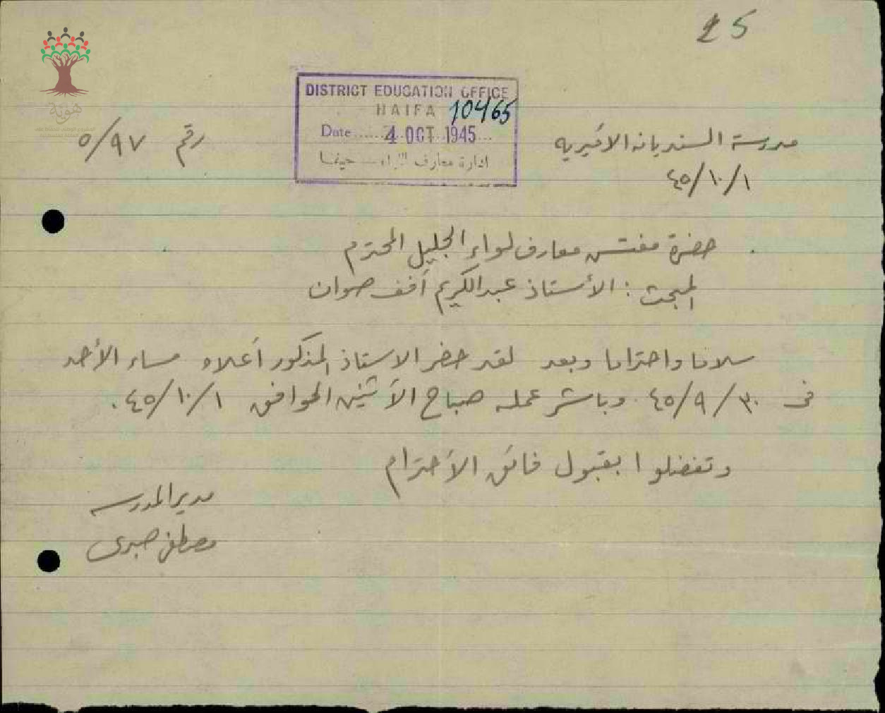 رسالة من مدير مدرسة السنديانة الى مفتش المعارف يخبره بأن المعلم عبد الكريم صوان قد باشر عمله