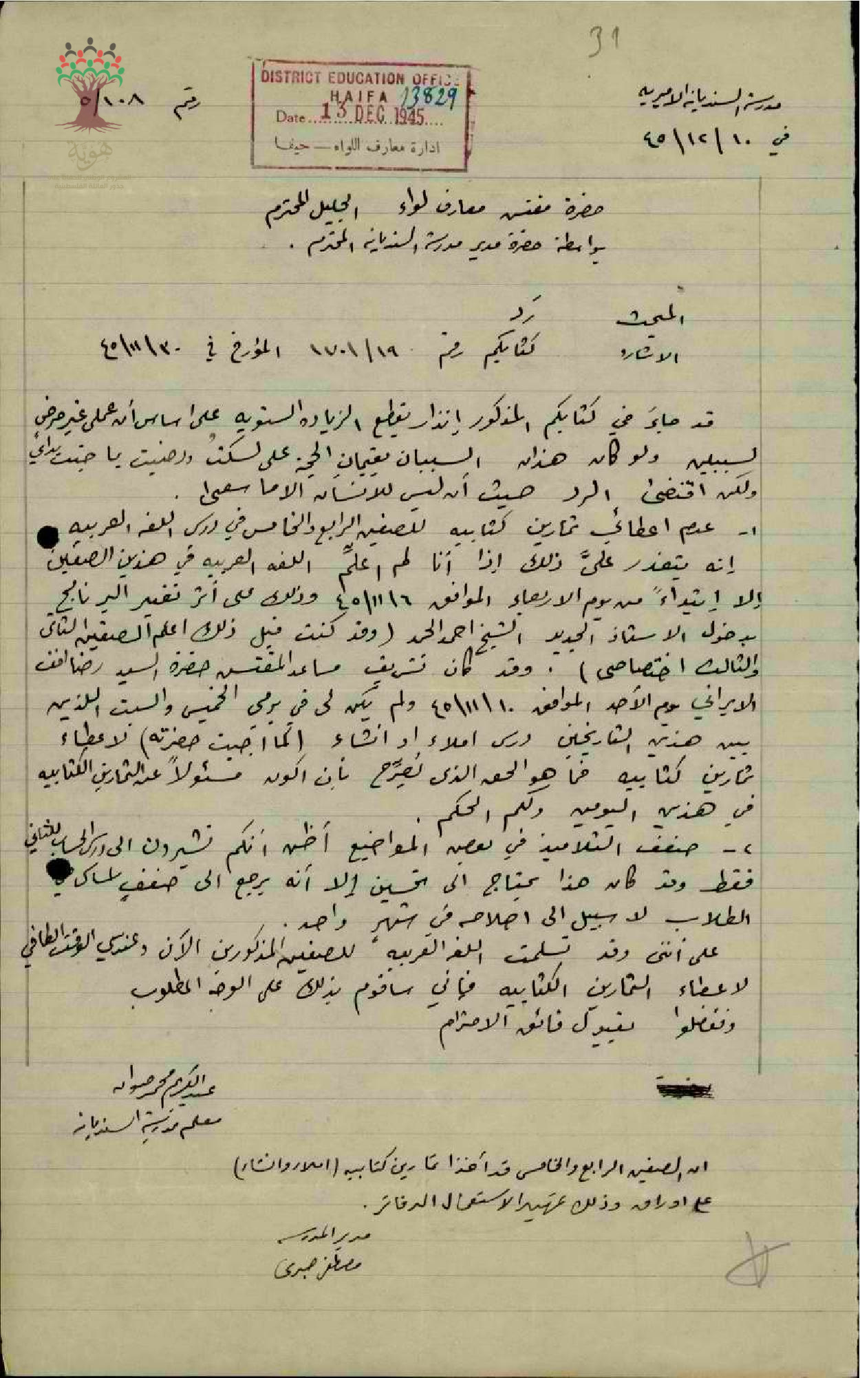 رسالة من المعلم عبد الكريم صوان الى مفتش المعارف يفسر اسباب الانذار الموجه اليه