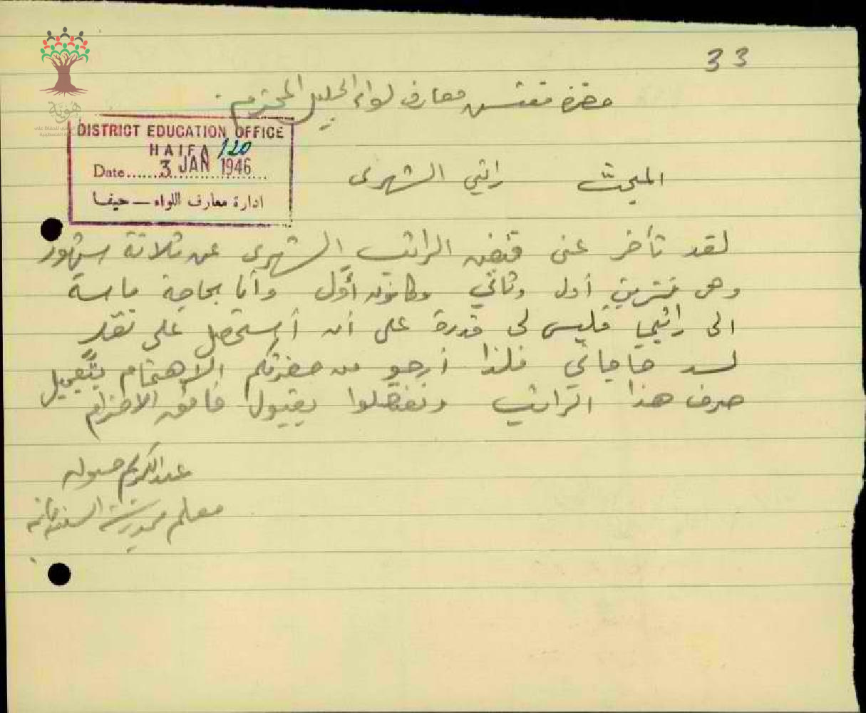رسالة من المعلم عبد الكريم صوان الى مفتش المعارف بخصوص تأخر راتبه الشهري