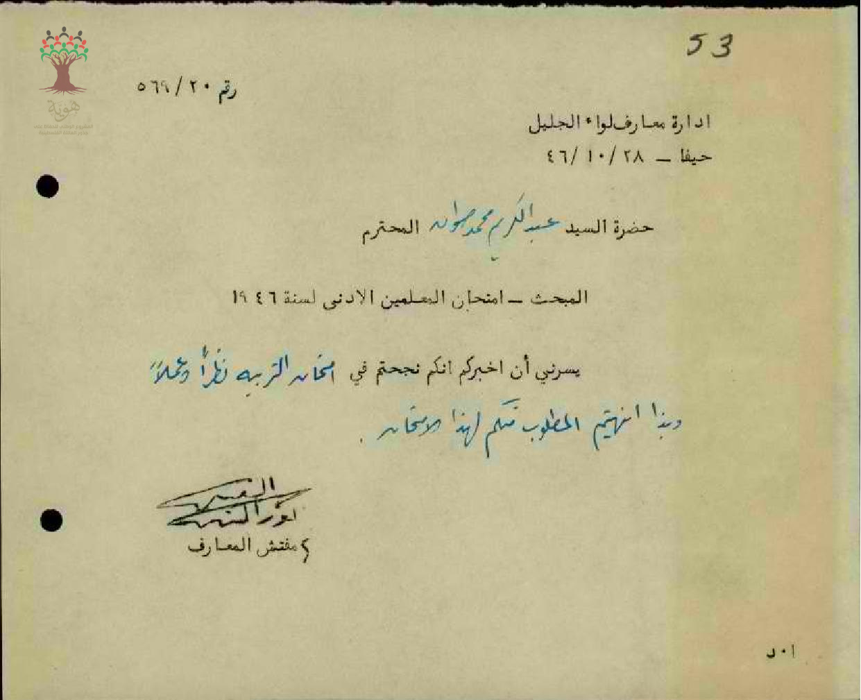 رسالة من مفتش المعارف الى المعلم عبد الكريم صوان بخصوص نتيجة امتحان المعلمين الأدنى لسنة 1946