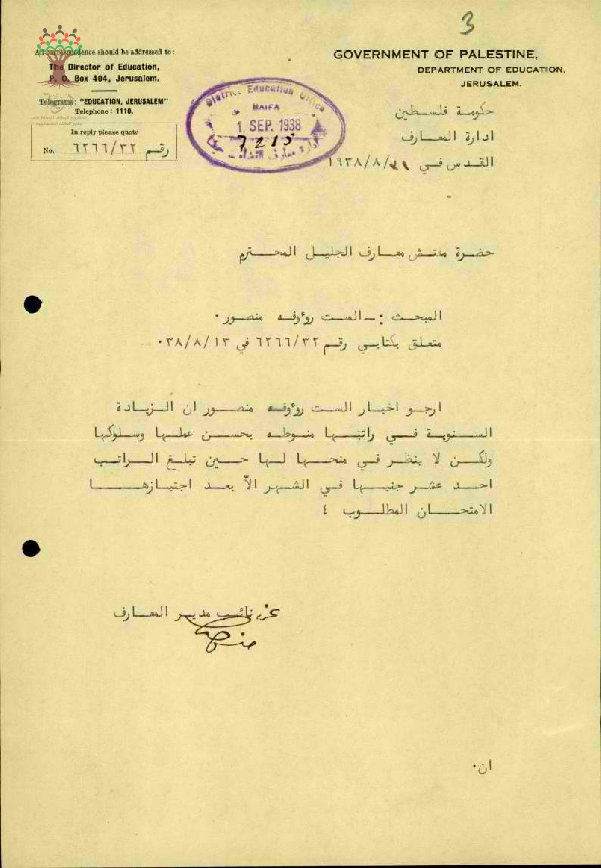 رسالة من مدير المعارف الى مفتش المعارف بخصوص شروط زيادة راتب المعلمة رؤوفة منصور