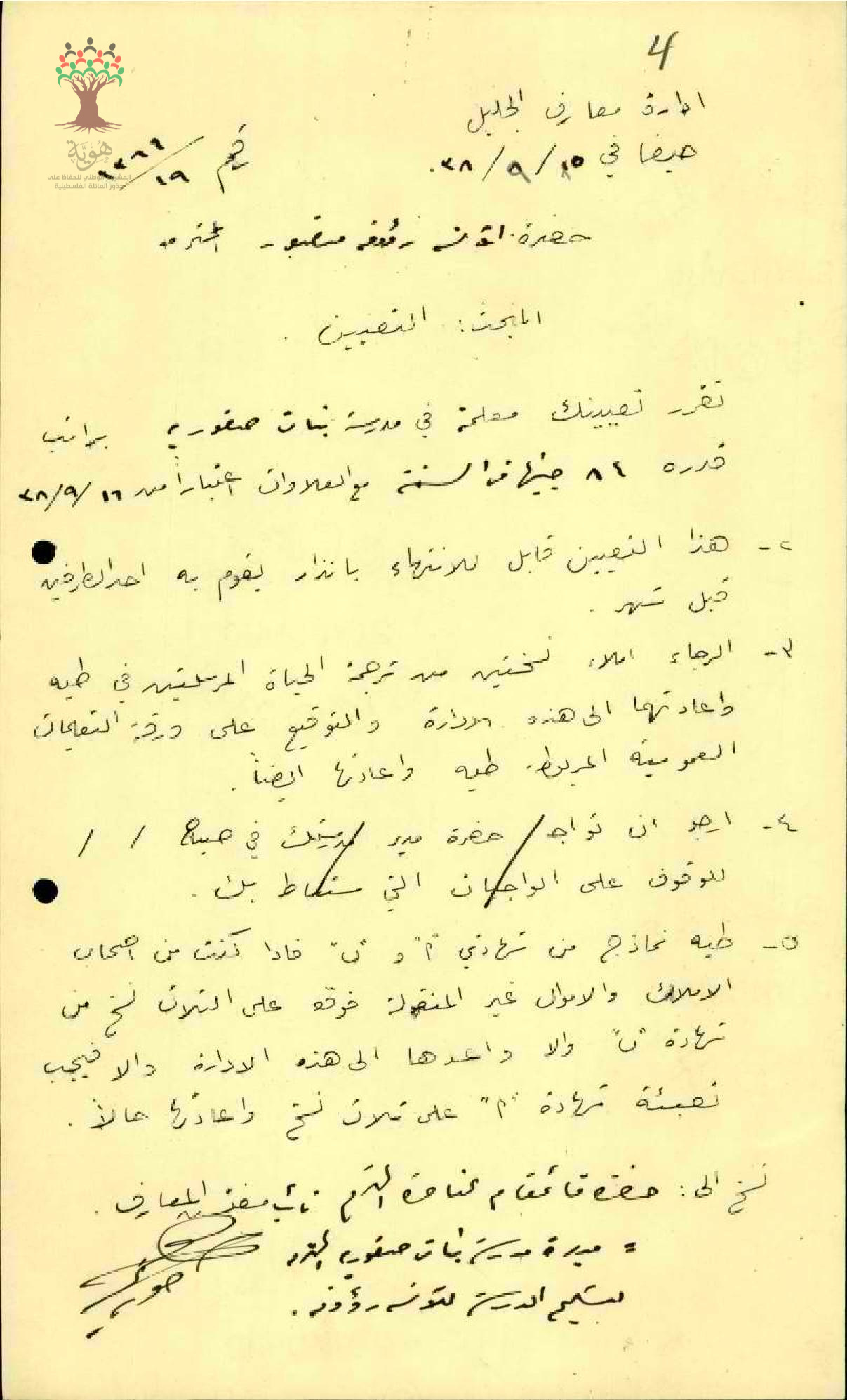 تعيين المعلمة رؤوفة منصور في مدرسة بنات صفورية
