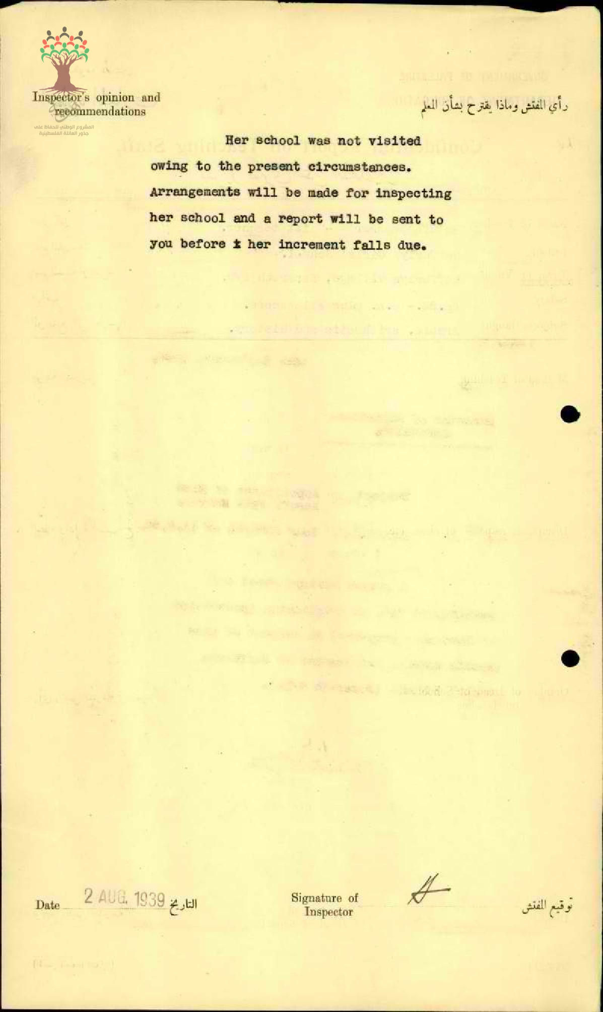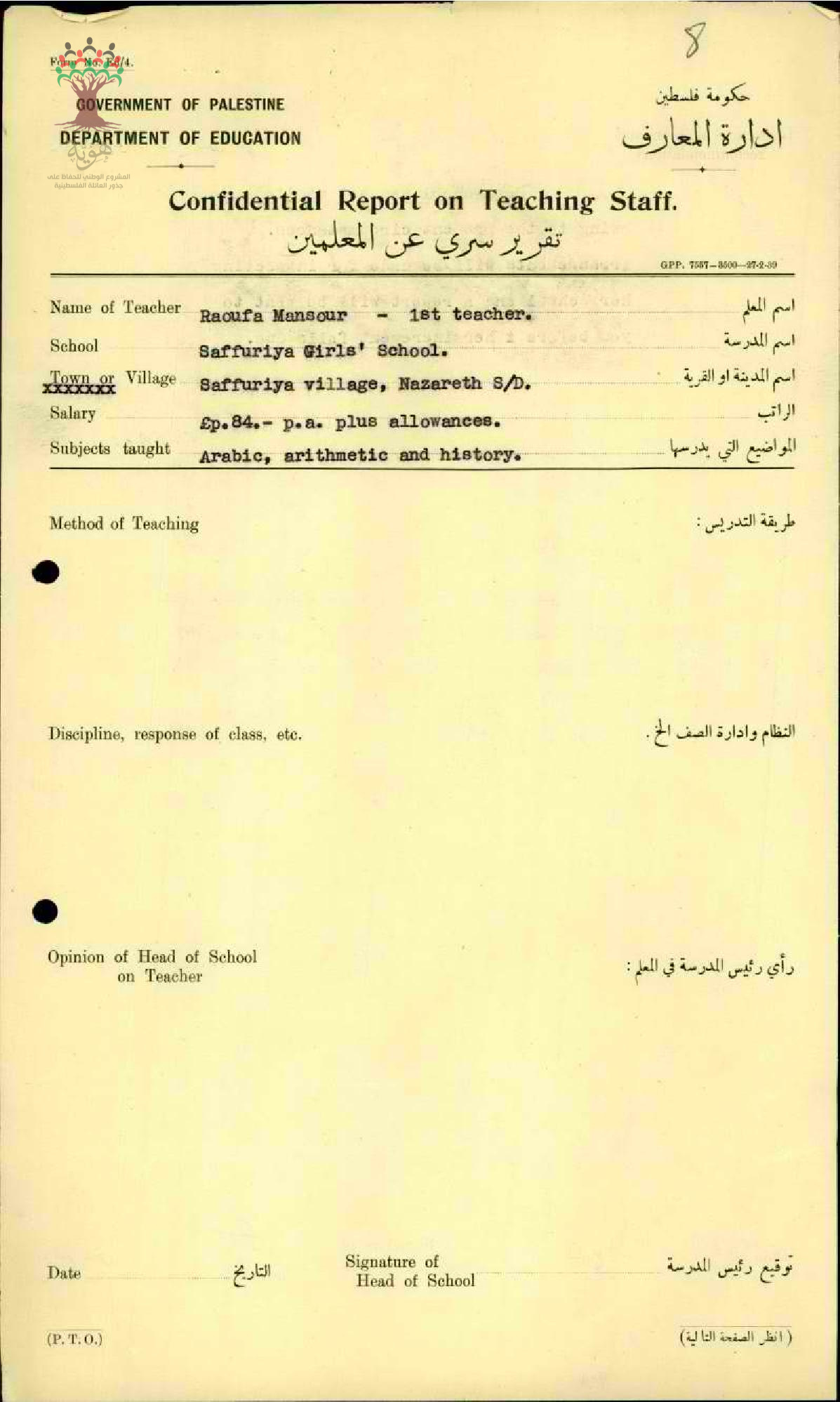تقرير تفصيلي عن أداء المعلمة رؤوفة منصور في مدرسة صفورية للبنات سنة 1939